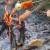 Mindig egy marokkal téptem a boglyából és kezdetét vette a SÜTÉS... A szalonnákat feltűztem egyszerre a nyársra, és lógattam a tűz felett, vittem kérget, kevés fát is, de a széna egyszerűbb volt. A szalonna súlya meg nehezebb, mint ahogy én feltételeztem! Többször landolt a "tűzben", mint kellett volna, ennek megfelelően, pernyés és kormos lett. Ez nem zavart, csepegtettem kenyérre, gatyára bőven. Póló nem volt rajtam, mert épp "kánikula volt" és tűzgyújtási tilalom.