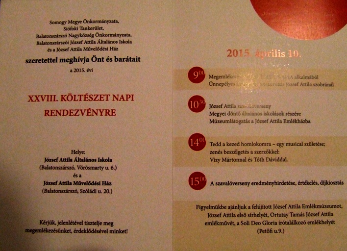 Balatonszárszón az idén is megünnepeljük a költészet napját. Két éve fogalmazódott meg bennem az ötlet, hogy legyen a magyar költészet napja nemzeti ünnep. Még nem lett. Bizonyossággal nagyon sokáig nem is lesz. Aki dönthetne az ügyben, a politika, nem tud vele mit kezdeni.