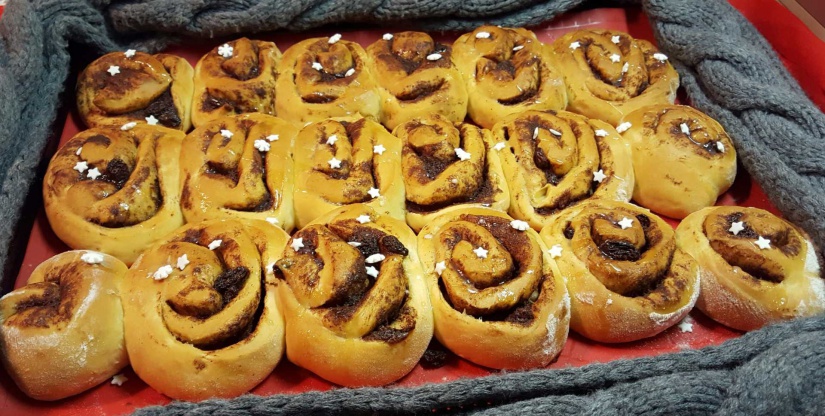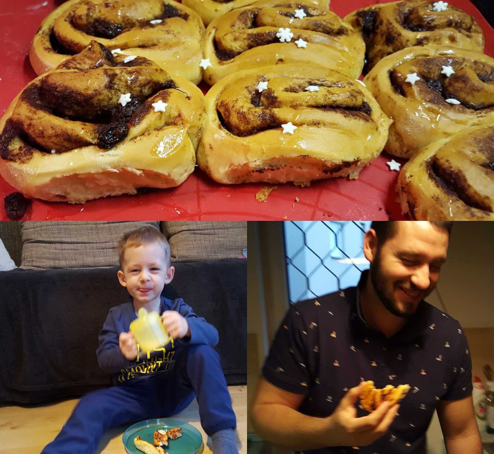 Nyújtsuk ki egy nagy téglalappá és kenjük rá egyenletesen a tölteléket, majd szórjuk meg mazsolával. A töltelékhez mindent alaposan keverjünk ki. A tészta egyik felén hagyhatunk egy kb. egy cm-es sávot, ahol nem lesz töltelék, ide mi kentünk egy kis felvert tojást, hogy szépen összeragadjon, de víz is megteszi. Hosszan feltekerjük és nagyjából egyforma széles csigákat vágunk. Egy sütőpapíros, vagy szilikon lapos tepsibe fektessük le őket, kis távolságra egymástól. Kb. 20 percet pihenhet így, de mi nem hagytuk túl sokáig, mert félelmetes növekedésnek indult volna:). A sütőbe helyeztük, amit kb. 160-180 fokra előmelegítettünk és szép, átsült színűre sütöttük, közben nagyokat szippantottunk az édes otthon illatából.