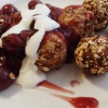 Próbáltuk ezt is megreformálni, hogy egy fogyókúrázónak vagy cukorbetegnek se kelljen lemondani róla. Itt is a megszokott adagokkal, dolgozunk, a darát kicseréljük zabra, így a nedvesség elszívó funkcióját ugyanúgy kitölti a reform alapanyag, a zab. A morzsa helyett mi pirított, diós-faféjas bundába forgattuk bele, és szósznak pedig egy meggyes pudingsodót készítettünk, cukor mentesen, steviával.