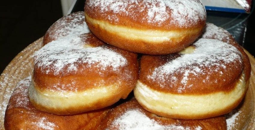 A hosszúkás alakú, habkönnyű fánkok félbevágva töltöttek és a tetejük csokimázzal van leöntve az eredeti recept szerint.
