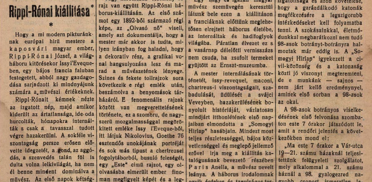 110 éve nyílt meg Rippl-Rónai József kiállítása a budapesti Ernst Múzeumban. Főként a kaposvári festőművész Franciaországban készült háborús festményei és rajzai voltak láthatók a tárlaton.