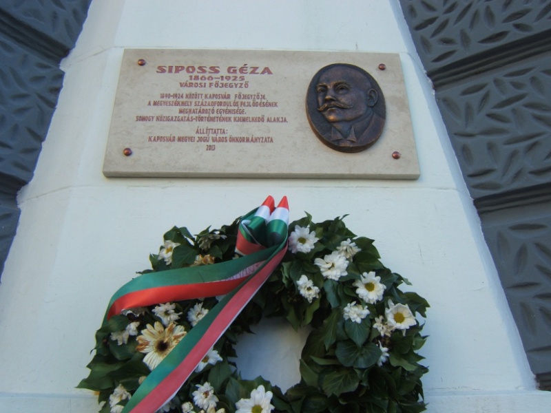 A városháza falánál, a tornyos Kossuth téri épület bejárata mellett 2013. március 18-án avatták fel Siposs Géza egykori városi főjegyző emléktábláját. Az idő pusztító hatalmát mi sem mutatja jobban, mint hogy a jeles köztisztviselőnek, aki az avatóünnepség előtt 147 évvel és egy nappal született, jóformán a nevét is alig ismerik már a megyeszékhelyen, pedig négy évtizeden át volt a városvezetés egyik legerősebb oszlopa, aki a várossá fejlődés talán legpörgősebb időszakában lerakta a modern kori helyi közigazgatás alapjait. (Maga is az ekkor keletkezett új városrészben, a hajdani Meggyes-telken kialakított Ezredév utcában lakott.) 1924. december végén, azon a városi közgyűlésen, amelyen döntöttek a nyugdíjazásáról, dr. Berger Samu képviselő „a városház eszének” nevezte az elköszönő főjegyzőt. Méltán fogalmazott így.