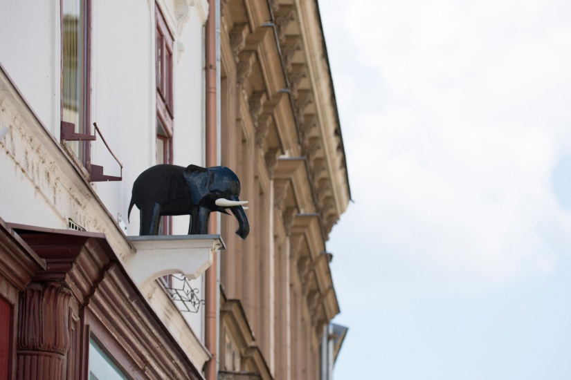 Megsárgult képeslapokon látható, hogy száz évvel ezelőtt hány cégér csalogatta a vevőket az üzletekbe és a műhelyekbe, bizonnyal hozzájárulva a 20. század eleji kaposvári bevásárlóturizmus fellendüléséhez. A jellegzetes cégérek közé tartozott az utca elejének egyik kereskedőházát ékesítő „fekete elefánt” is, amelyet hamar a szívükbe zártak a városuk hagyományaira büszke kaposváriak. Az egyedisége miatt is feltűnő cégért azonban – a járdák fölé nyúló táblák többségével együtt – a harmincas évek közepén leszerelték. A kedves kis ormányos lassan a feledés ködébe burkolódzott; Kaposvár alapos ismerője, Szigetvári György építész-díszpolgár sem mondhatott róla mást egyik várostörténeti könyvében, mint hogy „a cég kis elefántja ismeretlen helyre menekült”.