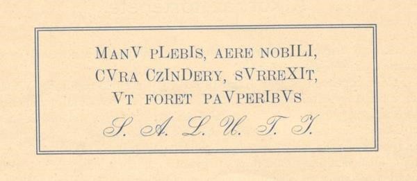 A márványtábla latin nyelvű szövege annyit mond, hogy a kórházat „a köznép kétkezi munkája, a nemesség pénze, Czindery törődése hozta létre az elesettek javára”. Első pillantásra úgy gondolhatnánk, hogy a szavakat kapatos állapotban véshette fel a mester, hiszen egyes betűk nagyobbra sikeredtek a többinél. Ezek viszont valamennyien római számként is értelmezhetők, s ha összeadjuk őket, az 1846-os évszámot kapjuk! (M-ből, D-ből és X-ből 1-1 van, C-ből és L-ből 2-2, V-ből és I-ből pedig 6-6.)