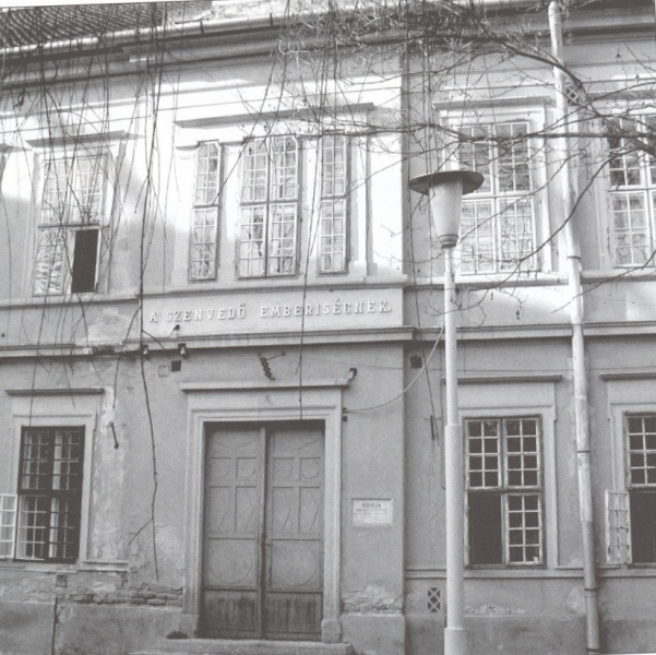A kórház elsőként elkészült épülete a Fő utcával párhuzamosan áll. Homlokzatán ez a felirat olvasható: „A szenvedő emberiségnek”.
