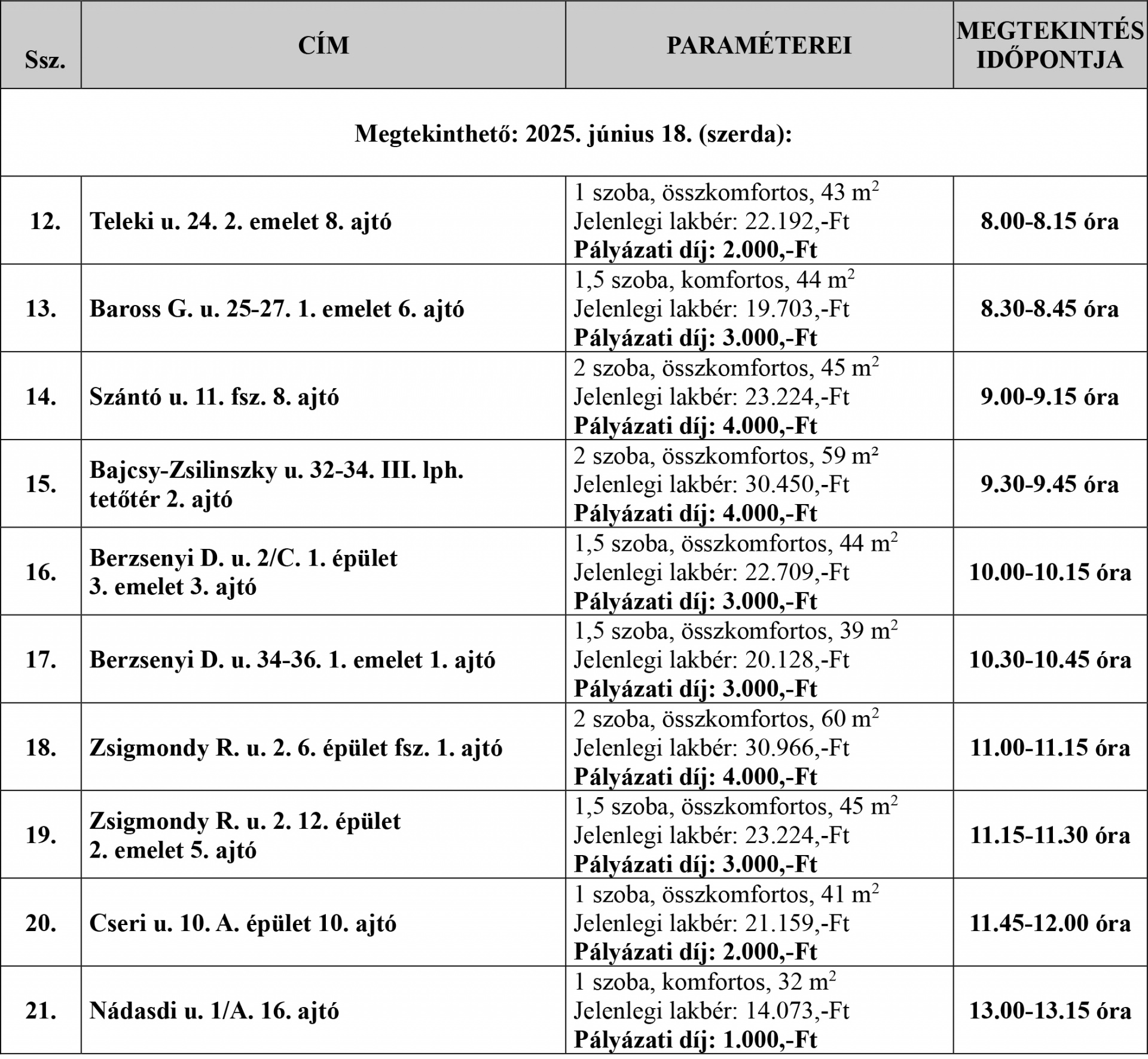 A lakások 2025. június 17. (kedd) és 2025. június 18. (szerda) napokon tekinthetők meg a lakásoknál jelölt időpontban.