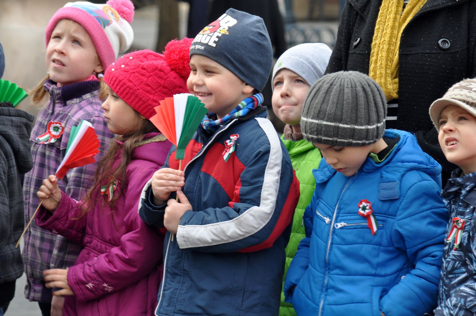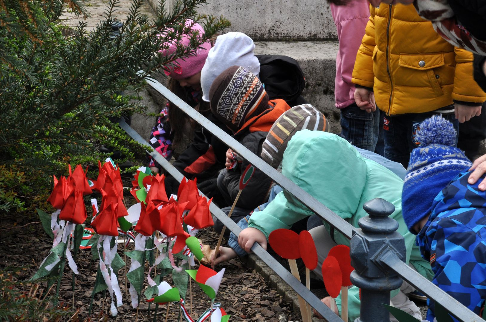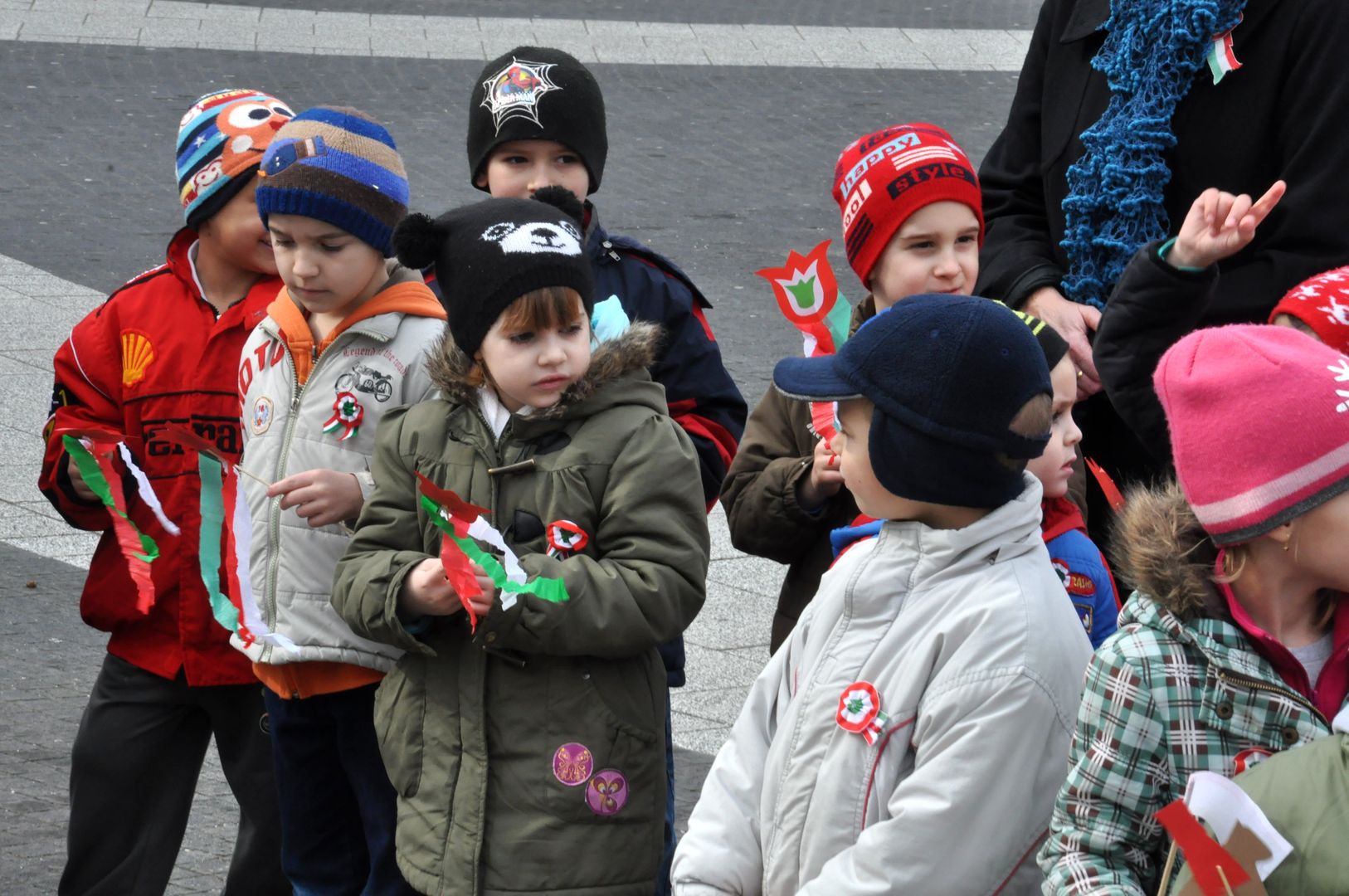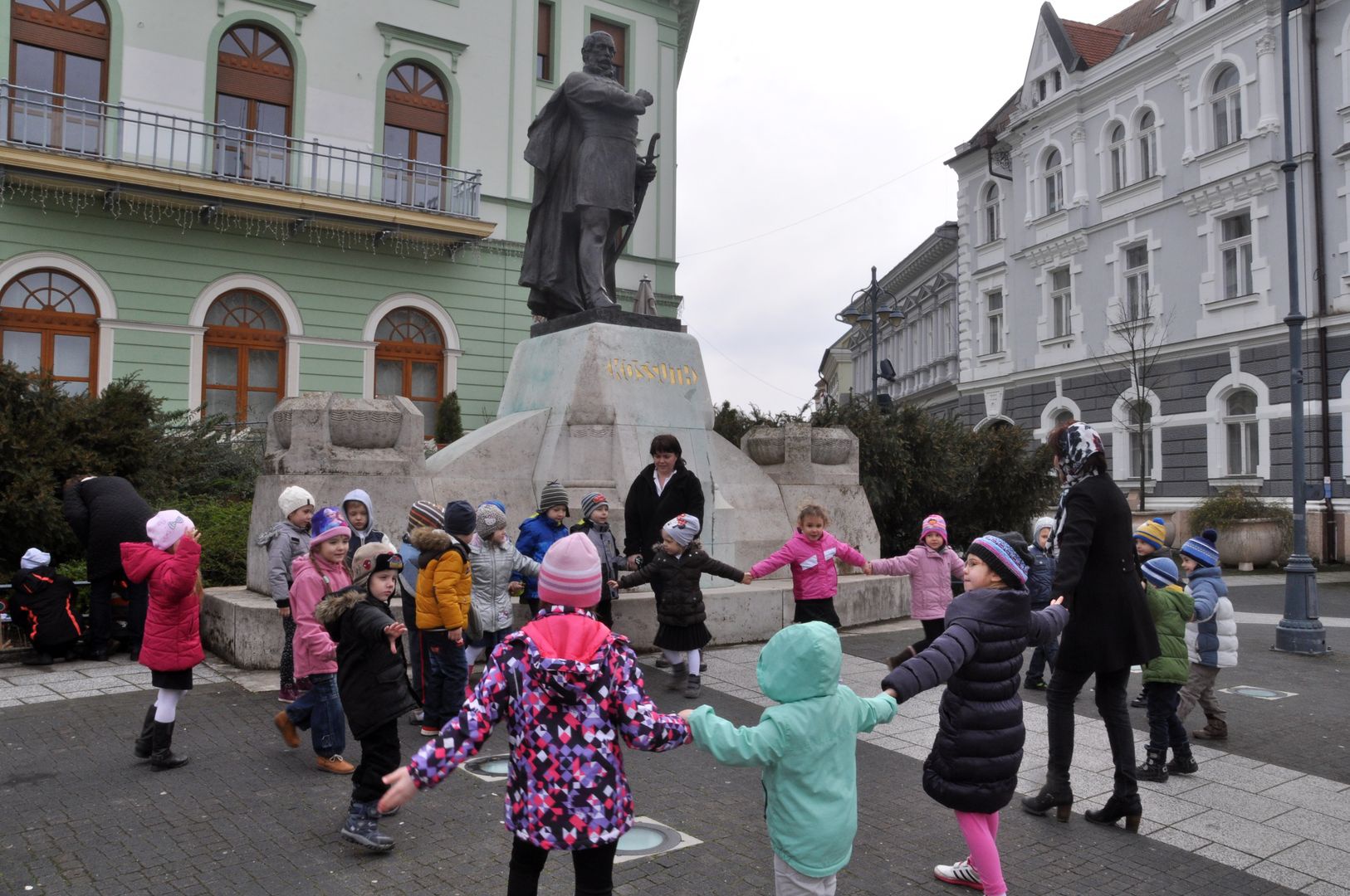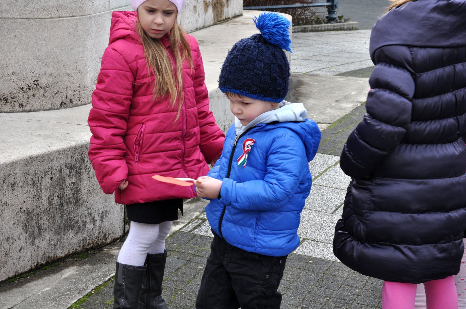 Pénteken délelőtt a város óvodásai - mint ahogy minden évben - saját készítésű zászlóikat és szélforgóikat helyezték el a szabadságharchoz kötődő személyek szobrainál, így Kossuth Lajos szobránál is. Egyes csoportok énekeltek és táncoltak is.