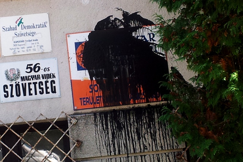 A kaposvarhirado.hu közlése szerint a Szent Imre utcai épület őre szombaton hajnali négykor járta körbe a házat, de akkor még semmi rendellenességet nem tapasztalt. Reggel hatkor a szolgálatváltás idején az újbóli ellenőrzéskor fedezték fel, hogy a Fidesz házfalon lévő tábláját fekete festékkel öntötte le valaki.