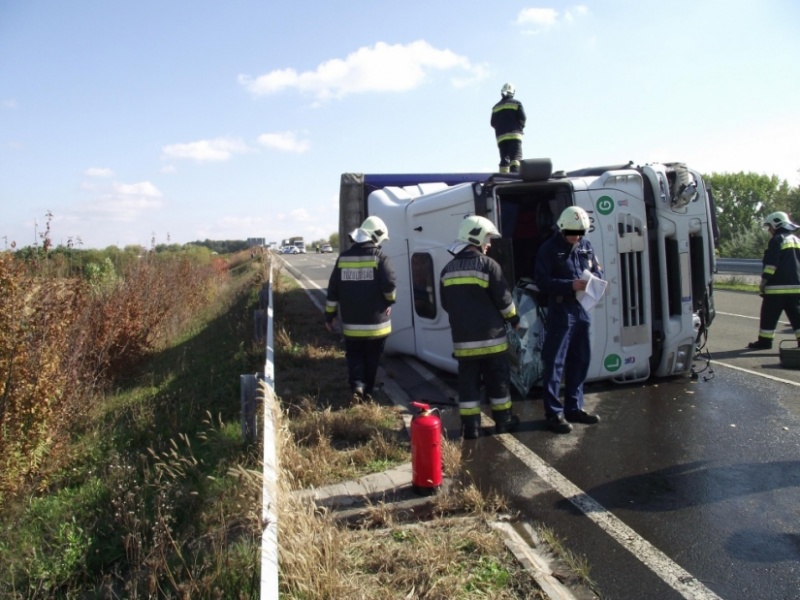 Közúti közlekedési baleset történt a 61-es főúton. Eddig tisztázatlan körülmények között egy kamion szalagkorlátnak ütközött, majd felborult. A helyszínelés és a műszaki mentés idején félpályás útlezárás volt érvényben.