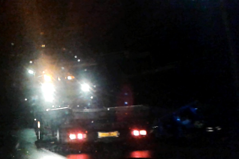 Az egyik - kevésbé összetört - autót kevéssel fél kilenc előtt szállította el egy tréler. A másik - felismerhetetlenségig roncsolódott autó kiemelése ezután kezdődött meg. A képeken ez látható. Az egyiknek a jobb oldalán látható egy kék folt a tréler mellett, az a roncs. Nehéz elképzelni, hogy valaki túlélte benne a balesetet - írja olvasónk.
