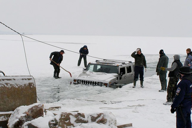 És vannak érdekességek is, a hatalmas, összegyűrődött jégtáblák, a vízbe beszakadt autó, vagy egy divatos hölgy, aki dacolva a hideggel pózol a tó partján.