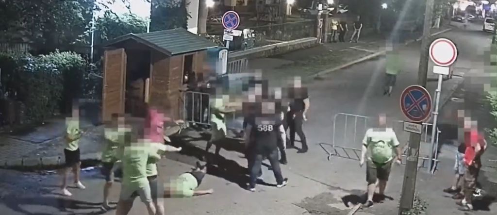 Ezt követően az egyik férfit a biztonsági őrök olyan erővel löktek a kordonon kívülre, hogy attól a földre esett, majd ugyanezt a férfit az egyik biztonsági őr le is fejelte, amiért a vádlottak eltúlzottan agresszív fellépését szóvá tette. Az indulatok végképp elszabadultak, amikor a legfiatalabb biztonsági őr az összetömörült legénybúcsús társaságot meglökte, az emiatt kialakult dulakodás során vádlottak az egyik férfit úgy megütötték és meglökték, hogy a földre esett és eszméletét vesztette.