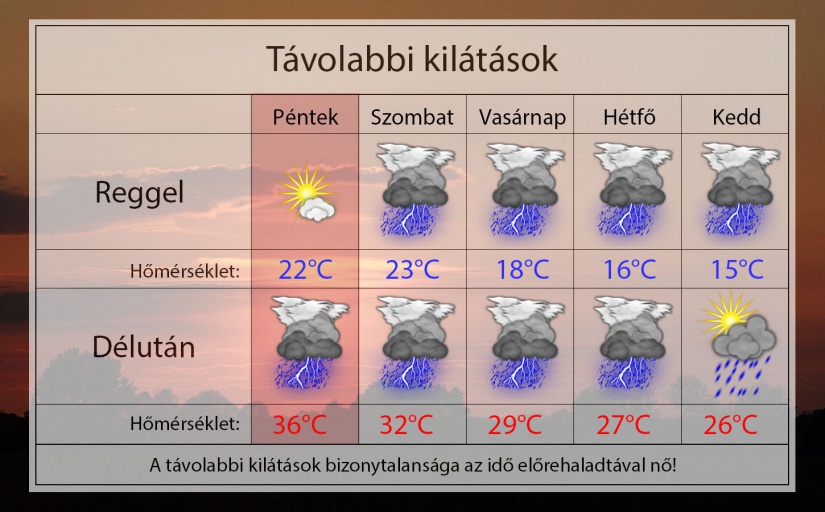 Péntek reggelre megnövekszik a felhőzet és csak 21 fokig csökken a hőmérséklet. Napközben változóan felhős lesz az ég, majd egyre több helyen lehet zápor, esetleg zivatar. Délután 36 fokig emelkedik a hőmérő higanyszála. Szinte szélcsend várható.