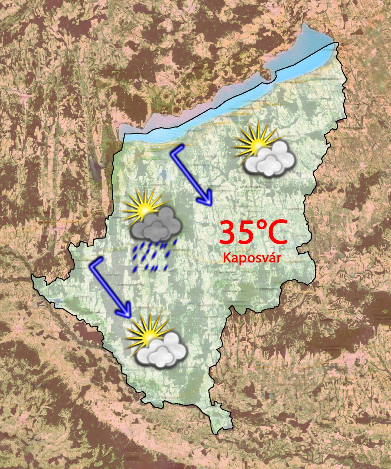 Péntek délután 34°C-ig emelkedik a hőmérő higanyszála. Változóan felhős, nyárias idő lesz. A szél északnyugat felől fúj majd. Nyugat felől esetleg zápor, zivatar érkezhet az este folyamán, mely frissítő széllökésekkel járhat.