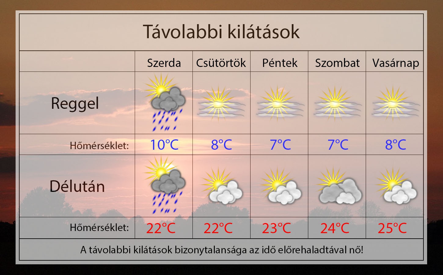 A hét második felében már nyugodtabb, koraőszies idő várható. Hétvégére melegedés kezdődik. A reggelek frissek lesznek 8-10 fokos minimumokkal, míg napközben 22-24 fok körül tetőzik a hőmérséklet.