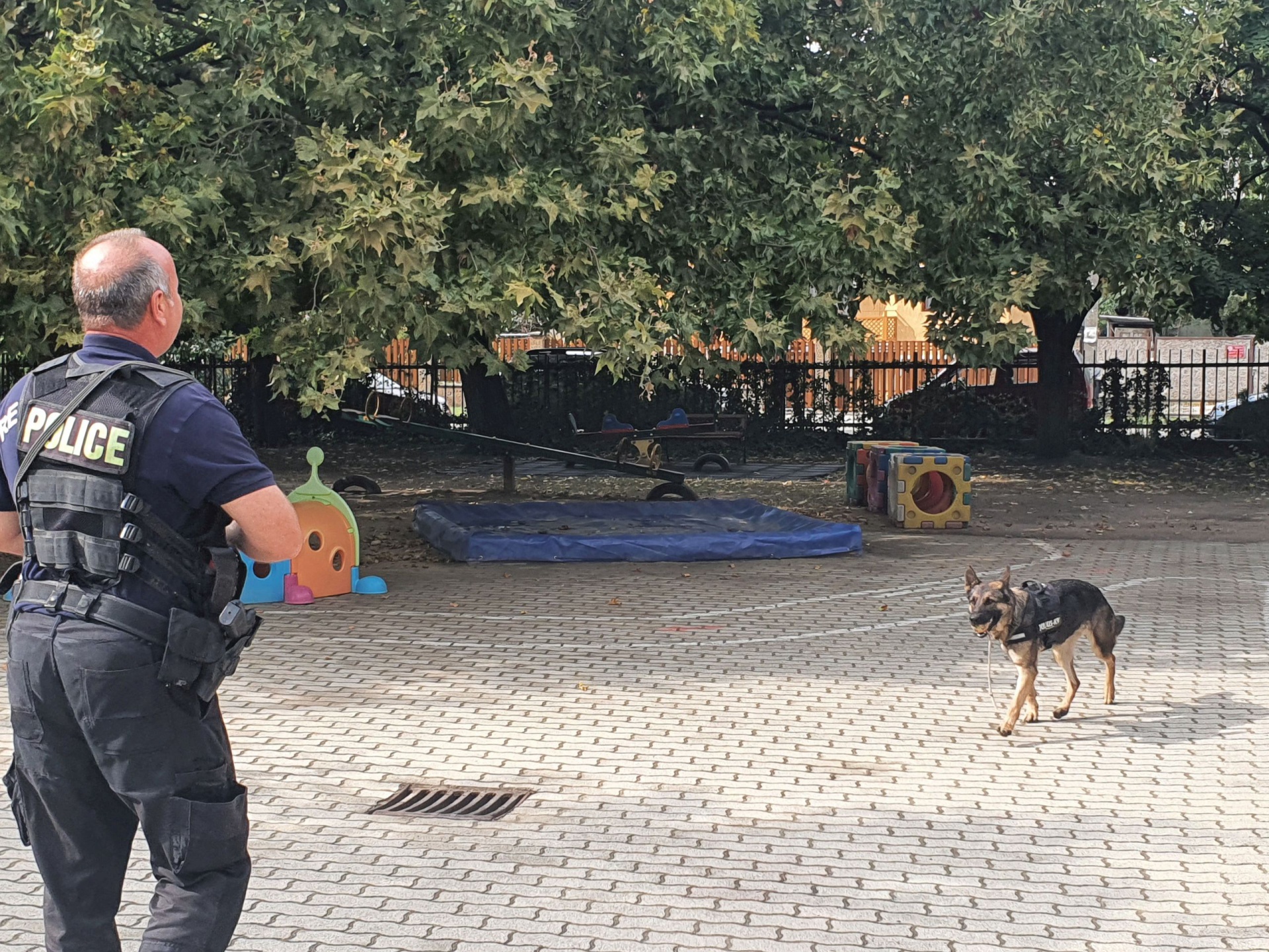 A megelőzési előadók hétfőn Másával, a somogyi rendőrkutyával és vezetőjével közösen tartottak bemutatót a Siófoki Pitypang Óvoda növendékei számára.
