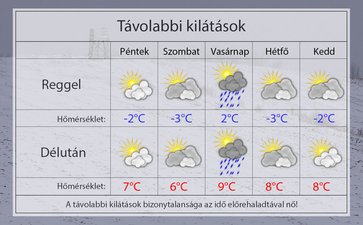A hétvégén hűvös idő várható és ismét sok lesz a felhő. Vasárnap kisebb záporesők is előfordulhatnak. Reggelente -3 és 0 fokig hűl le a levegő, míg napközben akár 7-9 fok is lehet, az éjszakák viszonylag enyhék lesznek. Komoly időjárásváltozás egyelőre nem valószínű.