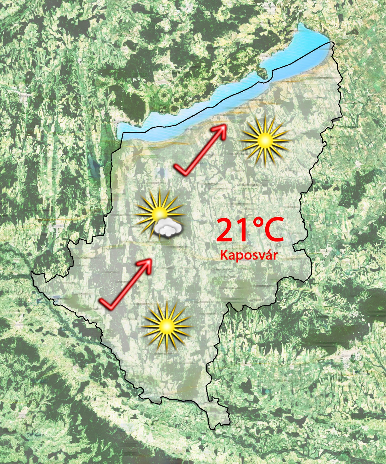 Szerdán reggel 7°C-ig csökken a hőmérséklet az erősen felhős, borongós ég alatt. Délután már borult idő várható, és estétől egyre több helyen ered el az eső. Délután 16°C-ig melegszik a levegő. A szél még délnyugat felől fúj.