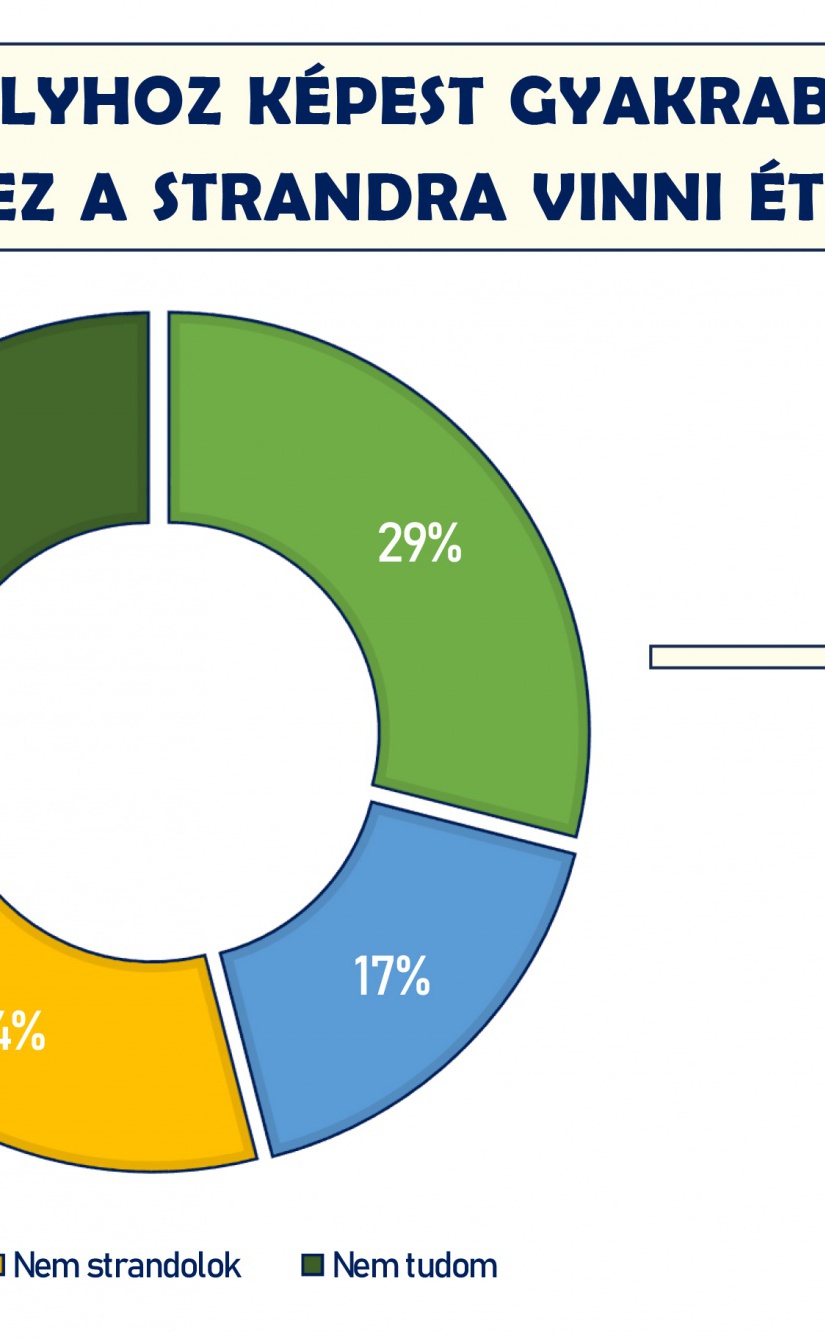 A strandra készülők egyharmada – ezen belül pedig a 30-as korosztály 40%-a – azt tervezi, hogy a tavalyihoz képest többször fog ételt vinni magával. A túlnyomó többség – 10-ből 8-an – ebben az esetben is arra hivatkozik, hogy ez az olcsóbb megoldás, a huszonévesek körében pedig már 90% indokolja anyagi okokkal a döntését. A megadott válaszlehetőségek között szerepelt az is, hogy az otthonról vitt ételek esetében tudjuk, mi van benne. Ez az érv az országos átlaghoz képest a fővárosban és Nyugat-Magyarországon volt népszerűbb, az itt élő 10 megkérdezettből 4-en emiatt is visznek saját ételt.