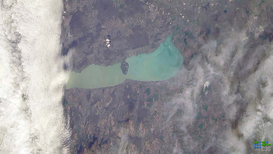 Felhőtakaró alól kikukucskálva üdvözli a tavaszt a Balaton a magyar műhold által készített felvételen.