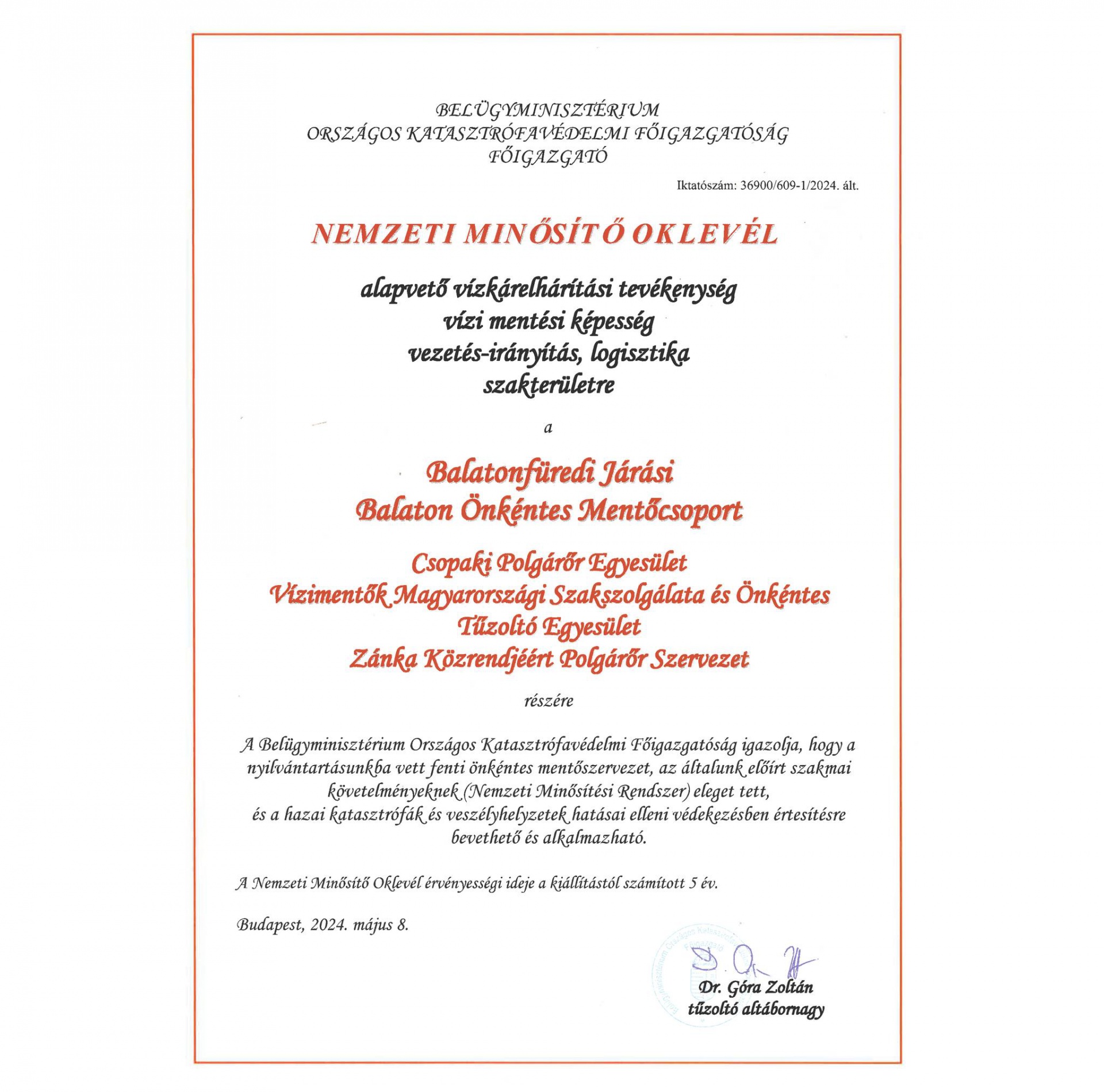 A szervezet sikeresen megújította a Nemzeti Minősítési Rendszerben szereplő tevékenységeit, úgy mint alapvető vízkárelhárítási tevékenység, vízi mentési képesség, vezetés-irányítás és logisztika.
