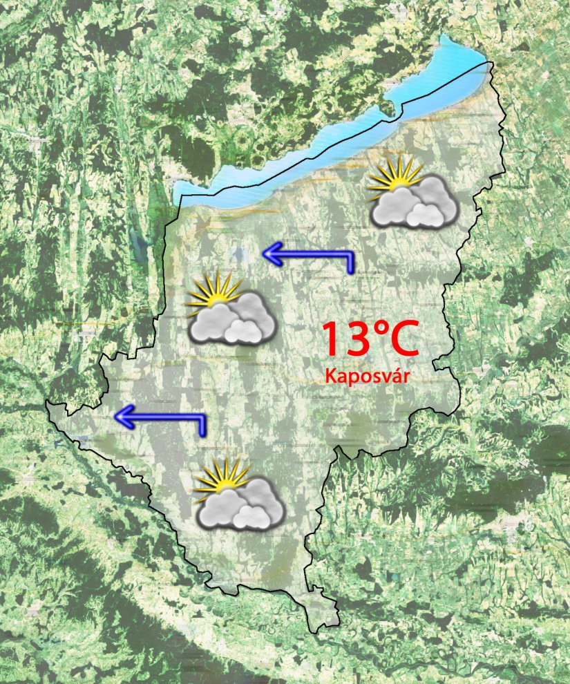 Csütörtök reggel közepesen felhős lesz az ég és csak 3°C-ig csökken a hőmérséklet. Napközben változóan, olykor erősen fátyolfelhős lesz az ég. 13°C-ig melegszik a levegő a gyenge keleti szél mellett.