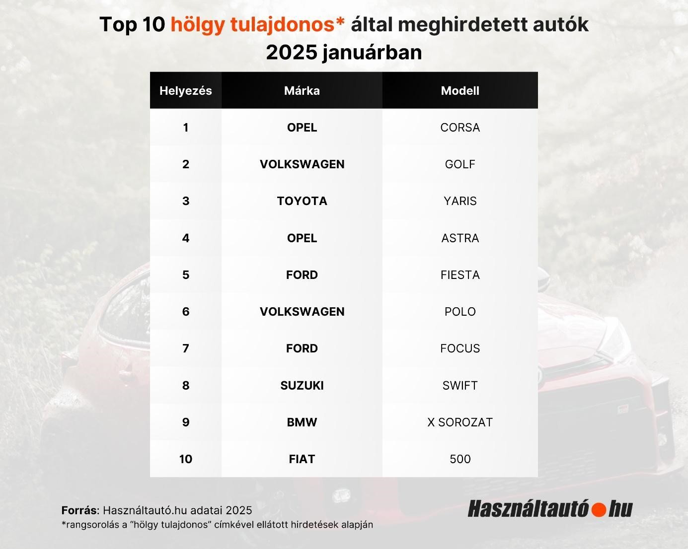 A VW Golf, Ford Fiesta és a BMW X sorozat pedig a 4., 6., és 8. helyen szerepeltek 2024-ben. 2025. januárjában a Corsa változatlan népszerűségnek örvendett a hölgyek által feladott hirdetések számát tekintve, az év első hónapjában majdnem 200 új ebbe a kategóriába sorolt Corsa került fel a portálra. A Golf két, a Fiesta pedig egy helyet javított a 2024-es évhez képest.