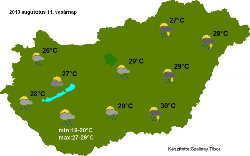 Szombaton a fent említett hidegfront alakítja időjárásunkat. A megnövekvő gomolyfelhőzetből többfelé várható zápor, zivatar, akár felhőszakadás és jégeső kíséretében. Az erős északnyugati szél az egész nap folyamán jellemző lesz, zivatarok alkalmával viharossá is fokozódhat. A délutáni hőmérsékletek már kellemesen, 26-28 fok között alakulnak.