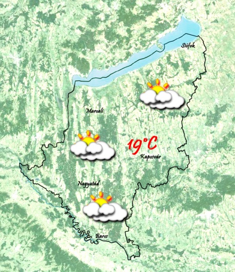 Csütörtök reggelén 9°C-ban eshet némi kevés eső. Borult, vagy erősen felhős lesz az ég. Napközben a felhőzet felszakadozik és gyenge északnyugati szél mellett friss, változóan felhős idő valószínű 19-20°C-al.