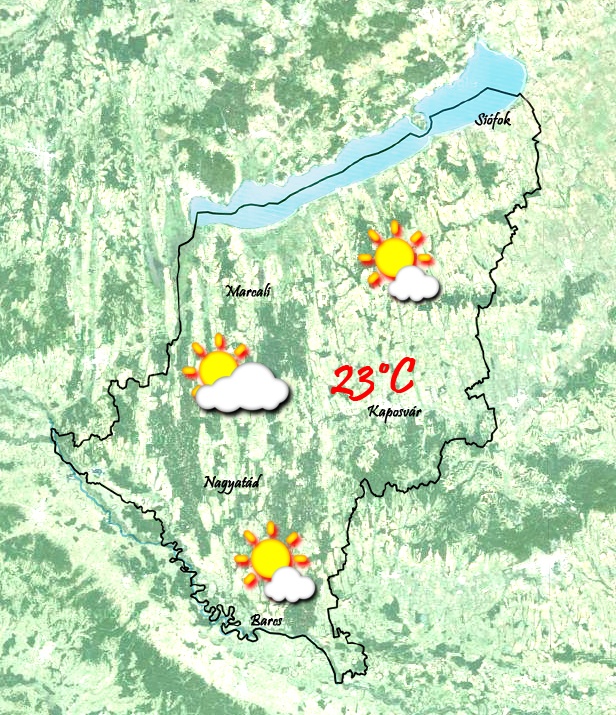 Kedden gyengén felhős lesz az égbolt. Néhol a 10 °C-os minimumhőmérséklet és a magas páratartalom miatt kialakulhatnak köd- és párafoltok. Délutánra 23 °C-ig melegszik a levegő és gyenge frissítő szél fog fújni. A nap is sokat fog sütni a néhány átvonuló gomolyfelhő között.