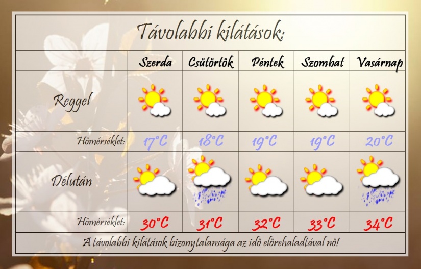 A hét második felében nyárias időnk lesz. A reggeli 17-19°C-okat 30-32°C-os délutánok követik majd. Napról napra emelkedik a hőmérséklet kicsit. Lesznek délutánonként gomolyfelhők, amik hűsítő árnyékot adnak. Csapadék csak kis eséllyel, elszórtan lehetséges.