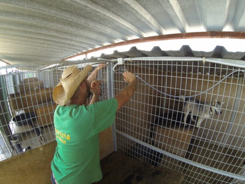 - Aki ismeri a telepünket, az tudja, hogy híján vagyunk az árnyat adó nagy fáknak. A kennelek alja beton, a teteje alumínium lemez, ezért ebben a hőségben a legkevésbé sem nyújt menedéket kutyáink számára. Évek óta (pontosabban harmadik éve) igyekszünk felvenni a harcot ezzel a kedvezőtlen adottsággal. Most ezt a korszerű megoldást választottuk a kutyák hűsítésére - tudtuk meg az elnöktől.