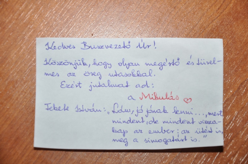 A buszsofőrök elmondták, hogy ritkán, de előfordult már, hogy szóban köszönetet mondtak az utasok, de ilyesmire még sohasem volt példa, viszont nagyon jól esik nekik, hogy gondolnak rájuk.
