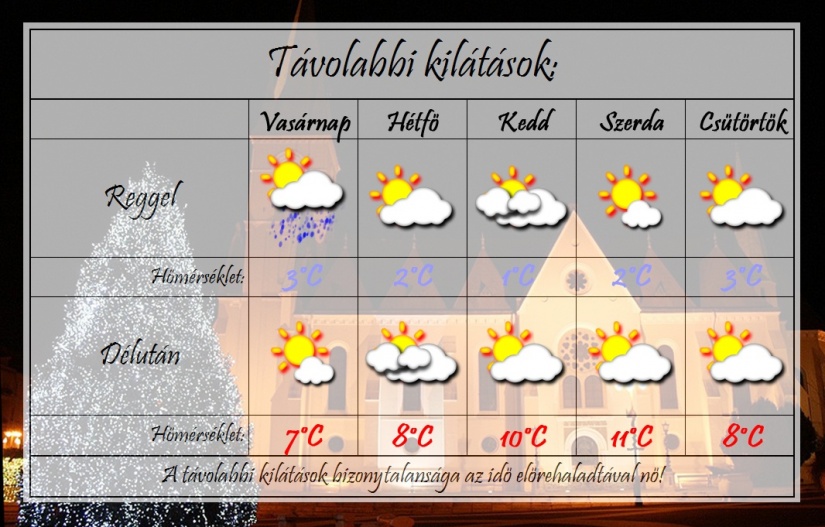 A jövő hét első felében a szél délnyugatira fordul, és meleg légáramlatok érkeznek. Emiatt a Karácsony fekete lesz, sőt inkább tavaszias időnk lesz, mint télies. A száraz levegő miatt a reggeli 1-2 °C-okat és talajmenti fagyokat délután 10-12 °C-ok váltják gyenge délnyugati széllel.