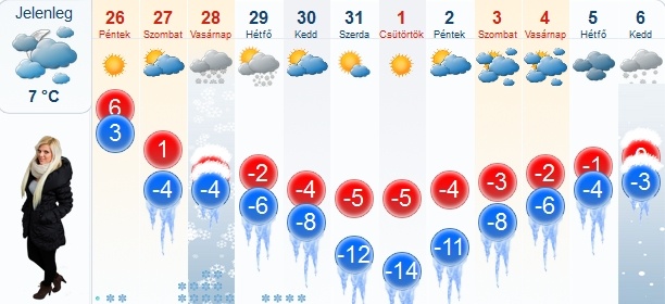 Pénteken, karácsony második napján még mindenütt kisüt a nap, de helyenként - legnagyobb eséllyel északkeleten - már hózáporok is kialakulhatnak. A Dunántúlon és a középső országrészben időnként megerősödik a szél is. A legalacsonyabb hőmérséklet többnyire mínusz 3, plusz 3 fok között alakul, de északkeleten néhol ennél pár fokkal hidegebb is lehet. A legmagasabb hőmérséklet plusz 3-7 fok között valószínű.