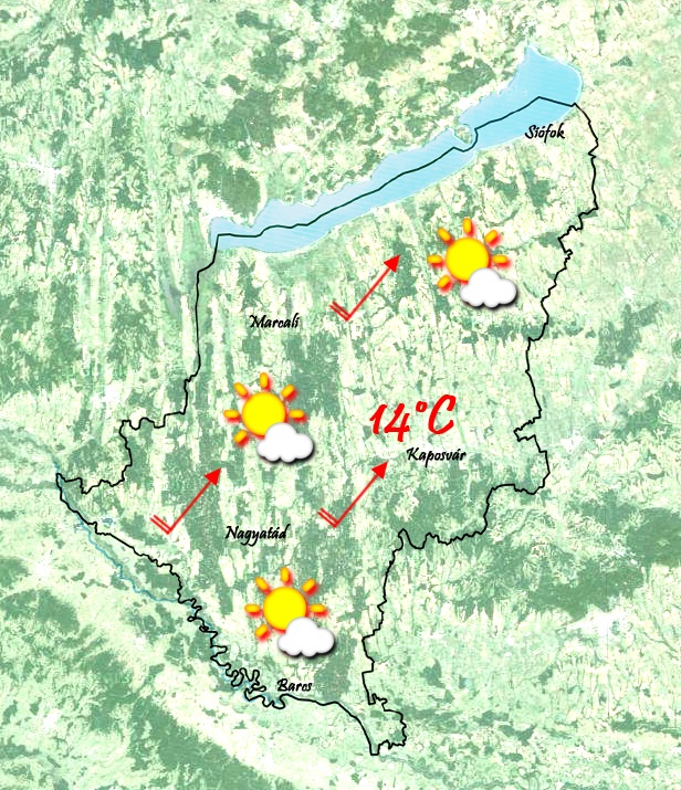Péntek délután sok napsütéssel telik majd. Az élénk délnyugati szél ellenére tavaszias lesz a hőmérséklet. 13-14 °C-ig is emelkedhet a hőmérő higanyszála. Néhol 15 °C-on is tetőzhet a nappali maximum.