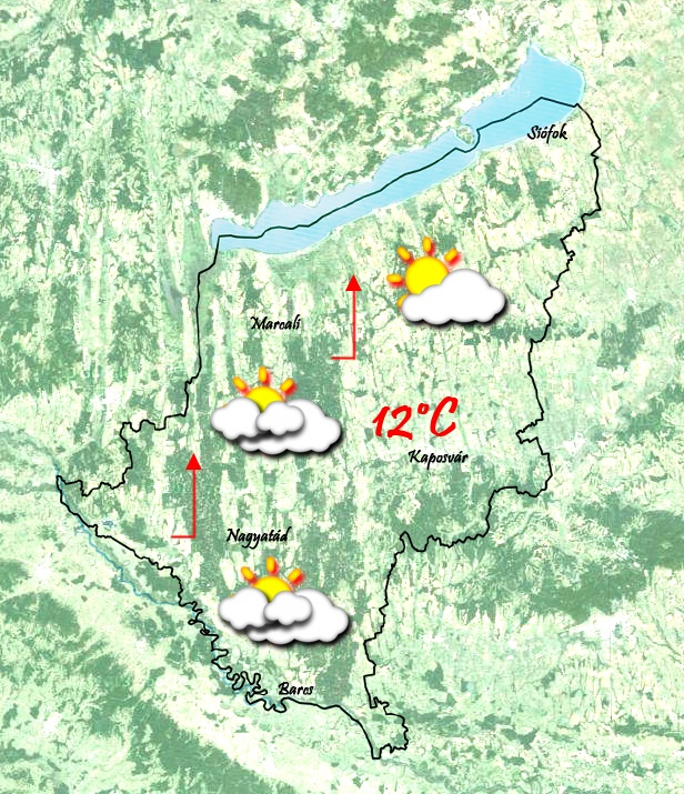 Szombaton reggel már lesznek felhők az égen. Néhol köd is képződhet. 2-3 °C körül alakul a minimumhőmérséklet. Napközben megnövekszik a felhőzet, de még mindig lehet kisebb napsütés. Délutánra 12 °C-ig melegszik a levegő. Továbbra is fújni fog a déli szél és néhol lehetnek élénk széllökések. Késő estére beborul az ég.