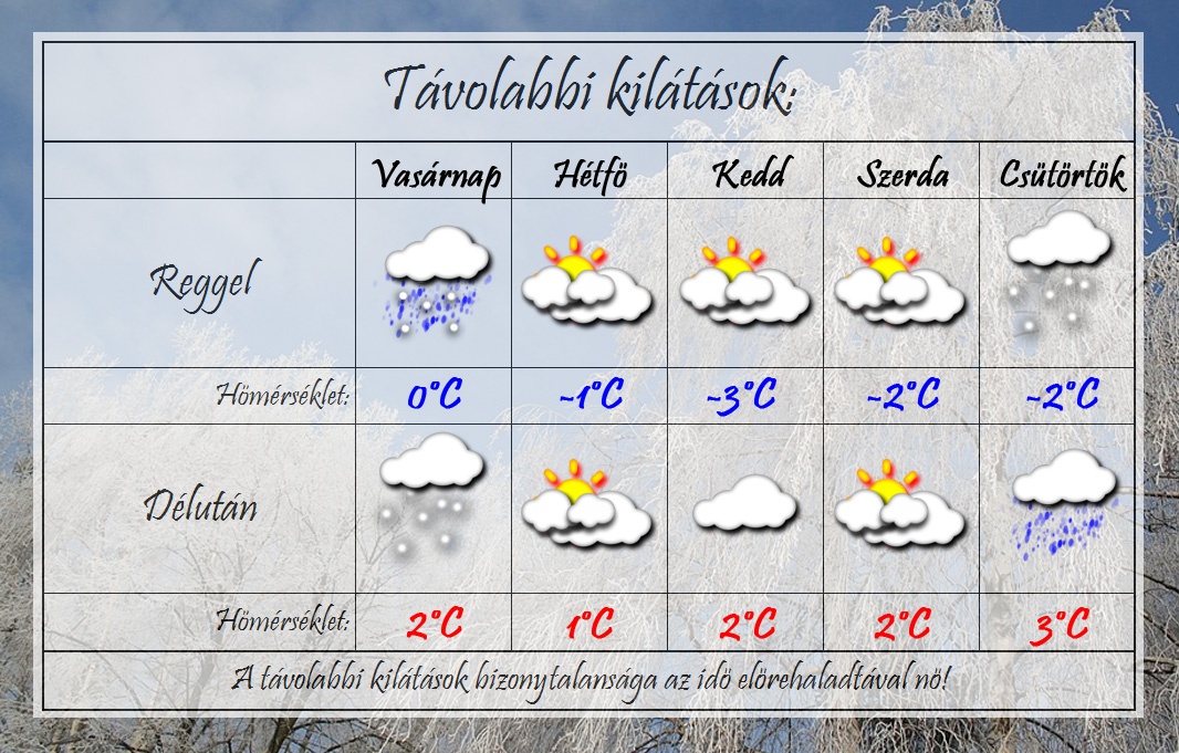 Vasárnap egésznapos, de gyenge havazás valószínű. A megye keleti felén havaseső is előfordulhat. Folyamatosan dől be a hideg levegő észak felől. A reggeli 0 °C-ot a szélhűtés miatt -5-10 °C-nak is érezhetjük. Napközben is 0+1 °C körül alakul a csúcshőmérséklet. Igazi télies jellegű időjárásunk lesz. Délutánra a havazás alábbhagy, de a szél továbbra is fújni fog.