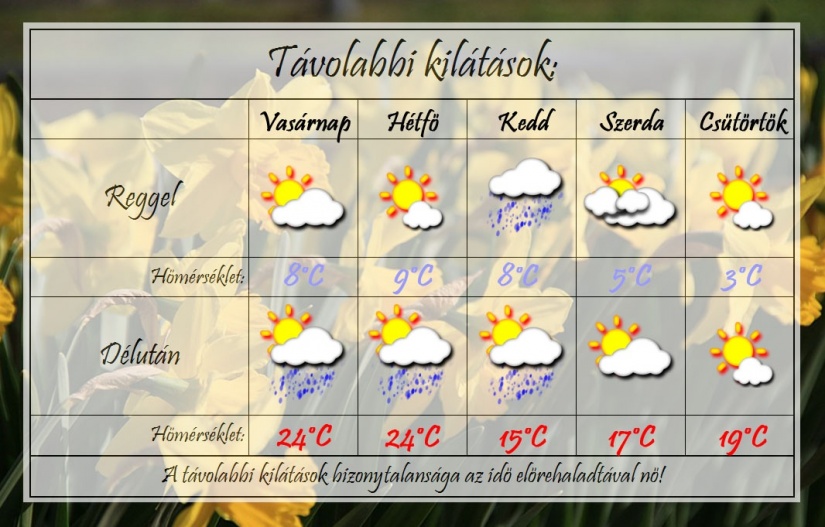 A jövő héten eleinte marad a derült reggel, délután záporos idő, ám keddre virradóra egy markáns hidegfront érkezik, aminek hatására sok csapadék hullhat. Később megélénkül az északnyugati szél és akár 10 °C-os lehűlés is lehetséges. A hét közepéig borongós, hűvös idő várható, majd ismét a tavasz veszi át a főszerepet.
