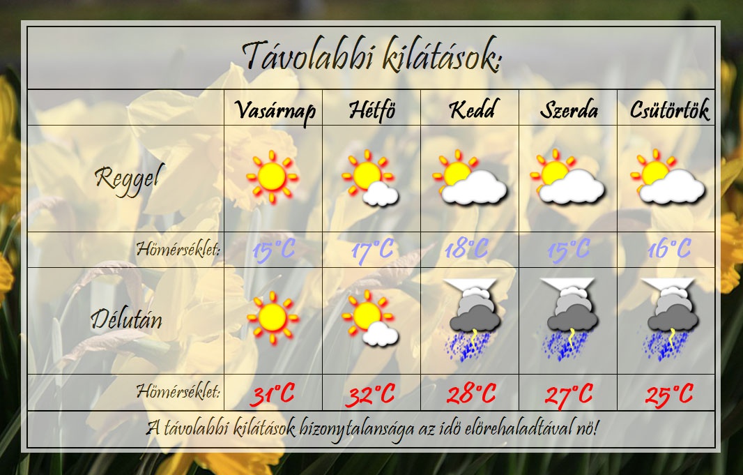 Vasárnap szintén masszív, tűző napsütés lesz a jellemző. Alig lesz felhő az égen. A reggeli 16°C-os friss minimumhőmérséklet után szintén 30°C feletti értékeket mérhetünk. A szél gyengén fog fújni kelet felől. Délután akár extrém magas UV sugárzás is lehet.