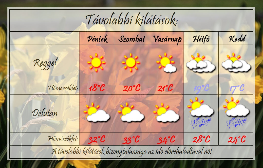 A hétvégén igazi kánikulára van kilátás. Délnyugat felőle meleg levegő érkezik, így jelentősen enyhülnek az éjszakák és emelkednek a délutáni csúcshőmérsékletek is. Első nagyobb hőségre van kilátás. Míg reggelente 20°C lesz a jellemző, addig délutánonként nem lesz ritka a 35°C sem. A jövő héten kisebb lehűlésre van kilátás, így a forróság mérséklődik majd. A lehűlés ereje, illetve a csapadék lehetősége még igen bizonytalan.