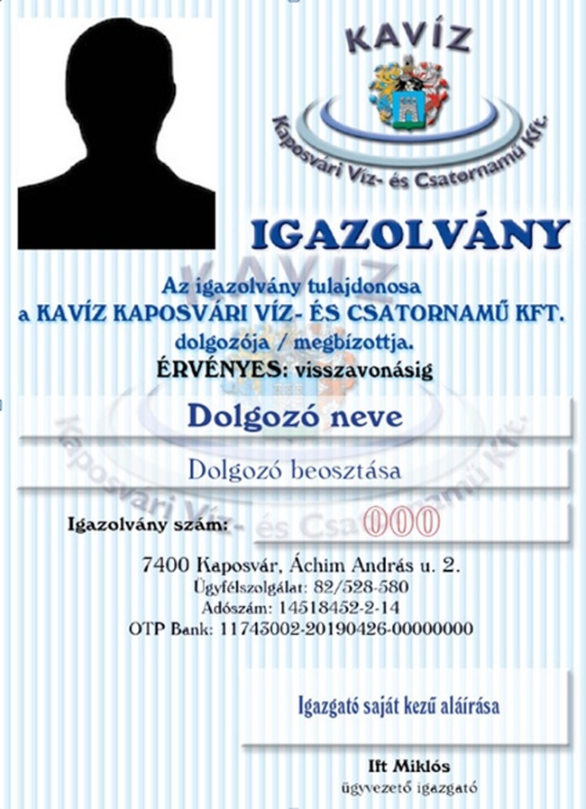 – Ilyen már csak azért sem fordulhat elő, mert két esetben kereshetik kollégáink az ügyfeleket: egyikük a vízóra-leolvasó, ő azonban nem ellenőriz; a hálózati ellenőr viszont mindig előzetes értesítést követően érkezik – ismertette az eljárást Genczler István, a Kaposvári Víz- és Csatornamű Kft. ügyvezetője. – Természetesen minden munkatársunknak fényképes igazolványa van, szerencsére az idős úr is tudta ezt.