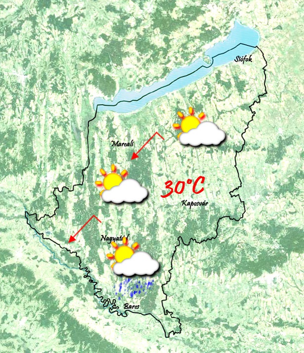 Szerdán reggel egy gyenge hidegfront érkezik. Hatására sokfelé felhősödés kezdődik. Napközben a meglévő felhőzet felszakadozik és kisüt a nap. A délutáni órákban ismét lehet szórványosan zápor, zivatar. A hőmérséklet a magasba emelkedik, így 30-32 °C-ot is mérhetünk nappali maximumként.