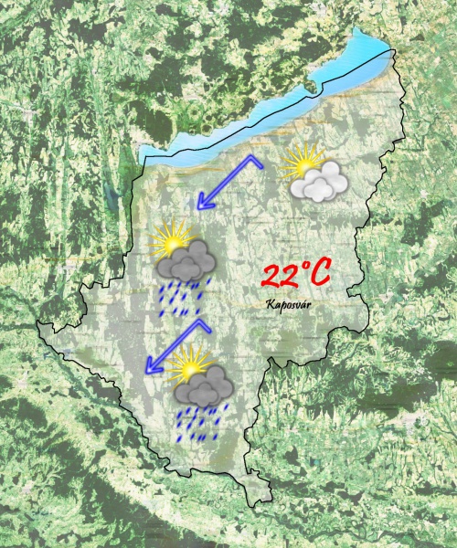 Szombaton reggel már javában borult lesz az ég. 17°C-ig csökken a hőmérséklet. Napközben egyre többfelé ered el az eső, záporeső. Néhol akár zivatar is lehet. A csapadék súlypontja még bizonytalan, de leginkább a megye keleti részét érheti a legtöbb csapadék. Délután enyhe idő lesz. Maximum 20°C-ig emelkedik a hőmérséklet és a továbbiakban is lehet eső, zápor. Egy ciklon vonul át az ország felett, aminek útvonala még bizonytalan, így a csapadék mennyisége még mindig bizonytalan. A szél leginkább észak felől fog fújni, tovább csökkentve ezzel a hőérzetet.