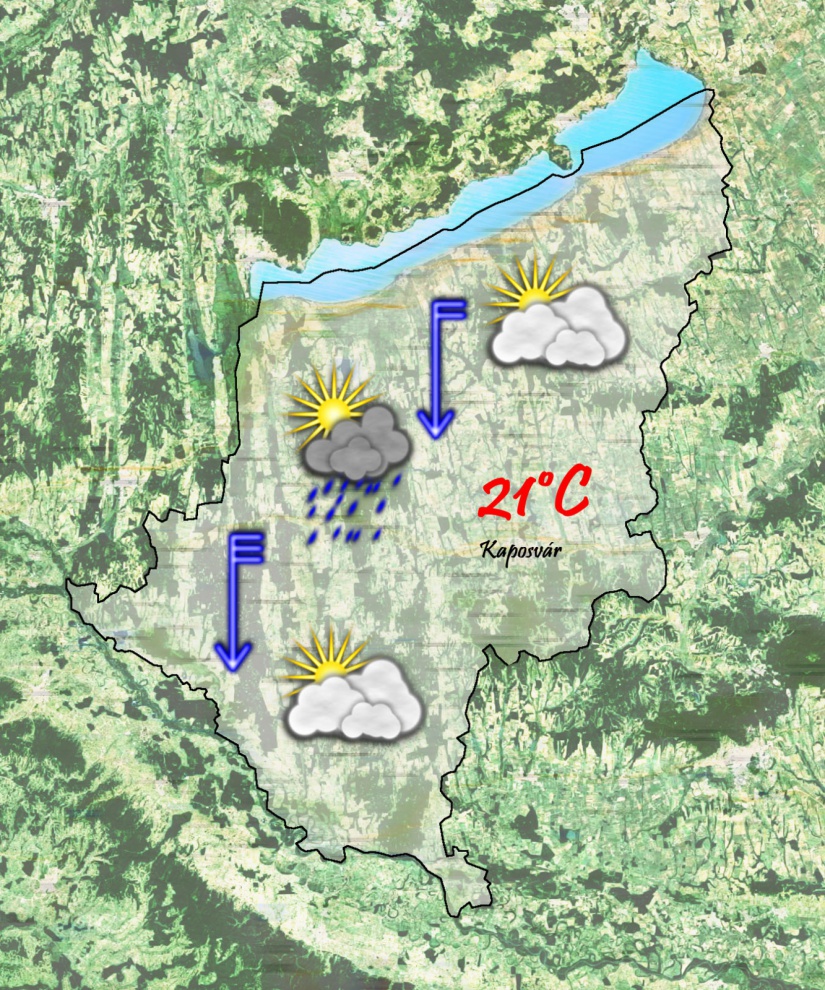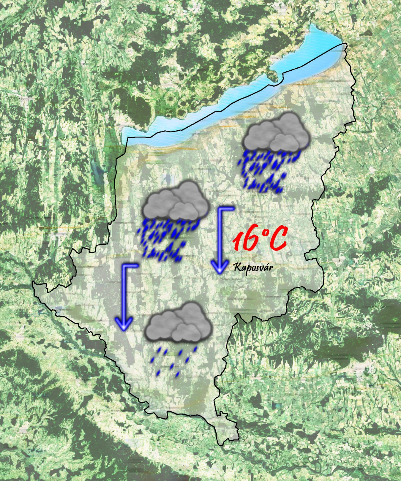 Pénteken igazán őszies, borult és esős idő vár ránk. A hidegfront egy ciklont generál az országtól délre, és ennek hatására egyre többfelé ered el az eső. Legelőször a megye déli részén indul meg a csapadék, végül délelőtt már az egész megyében valószínű csapadék. Eső, zápor nagy eséllyel valószínű. Reggel 13-14 °C lesz, míg délután csak 17-18 °C-ig emelkedik a hőmérséklet. A csapadék majd csak estére hagy alább és szűnik meg, de még az éj leple alatt is lehet egy-egy zápor.