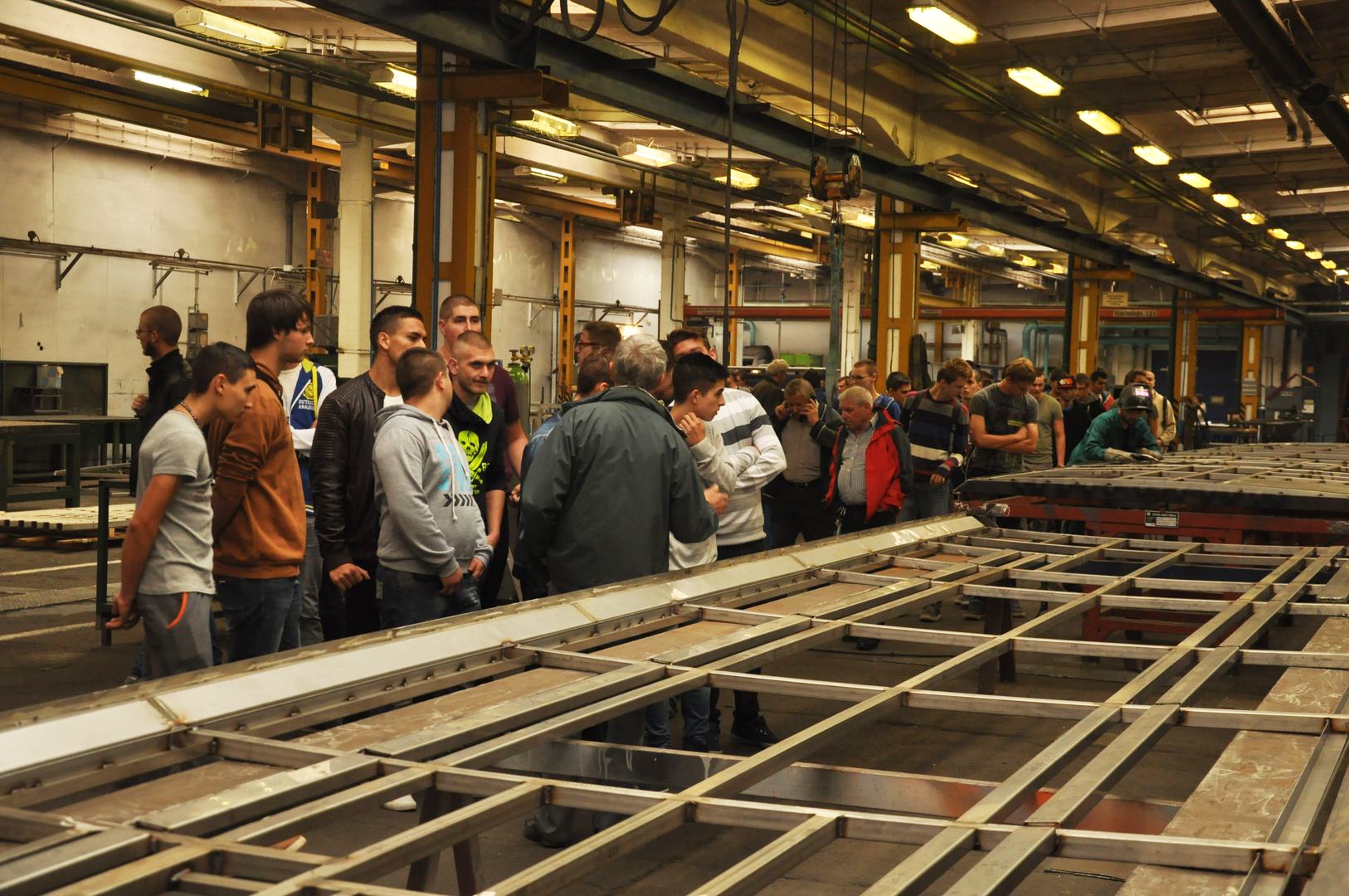 Innen a vázas üzembe vezetett az útjuk, ahol az egész világon egyedülálló technológiát figyelhettek meg. Itt ugyanis az új, Modulo autóbuszok vázát előre legyártott elemekből állítják össze. Így a beépített modulok számától függően meghatározhatják, hogy milyen hosszú legyen a jármű, 6,8 métertől egészen 10 méterig. A fotózás sajnos itt sem volt engedélyezett, a fiatalok azonban kíváncsian figyelték a gyártási folyamatot, az elemek összeillesztését.
