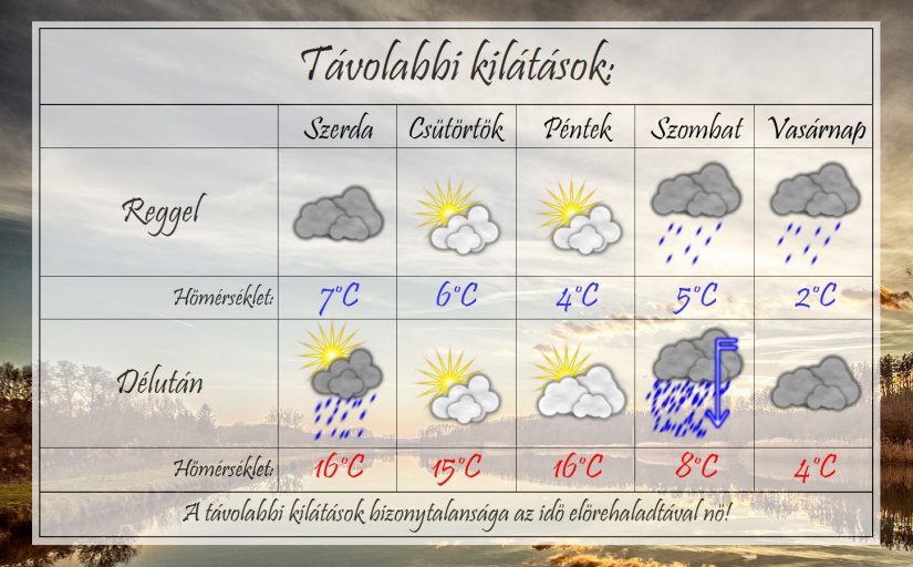 A hét második felében folytatódik az enyhe, változékony idő, ám a hétvége erős lehűlést és kiadós csapadékot tartogat. Szombaton egy erős ciklon érkezik sok esővel, sőt a hegyekben, de akár síkvidéken is van esély havasesőre, hóra. Hétvégéig még 15-17°C-os maximumokban lehet részünk, de a ciklon érkeztével jó ha 5-6°C-ig melegszik csak a levegő.