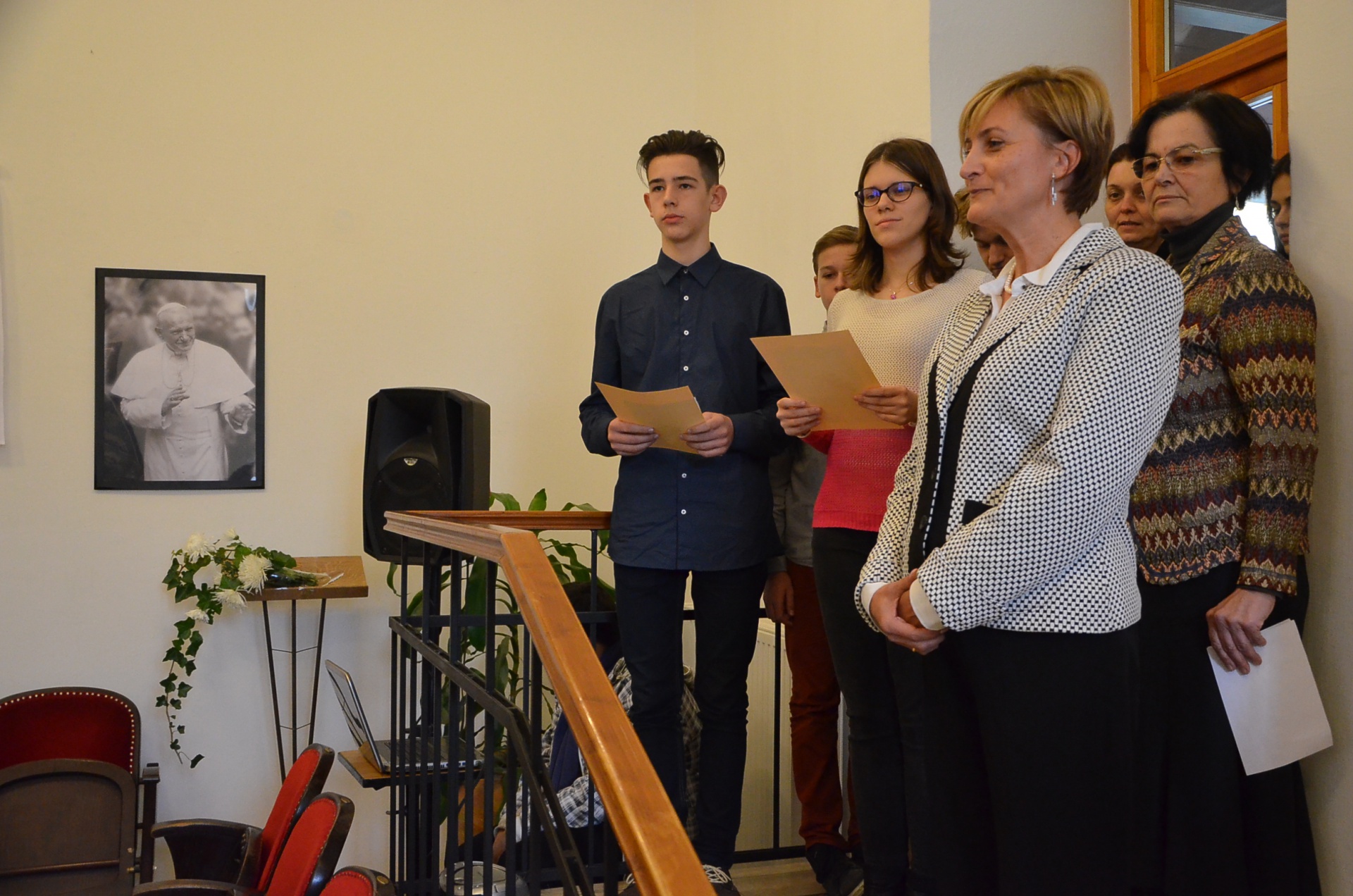 A katolikus iskola már a csütörtöki avatás előtt bő egy héttel készült az eseményre, hiszen II. János Pál életéről nyílt fotókiállítás az I. emeleti aulában.