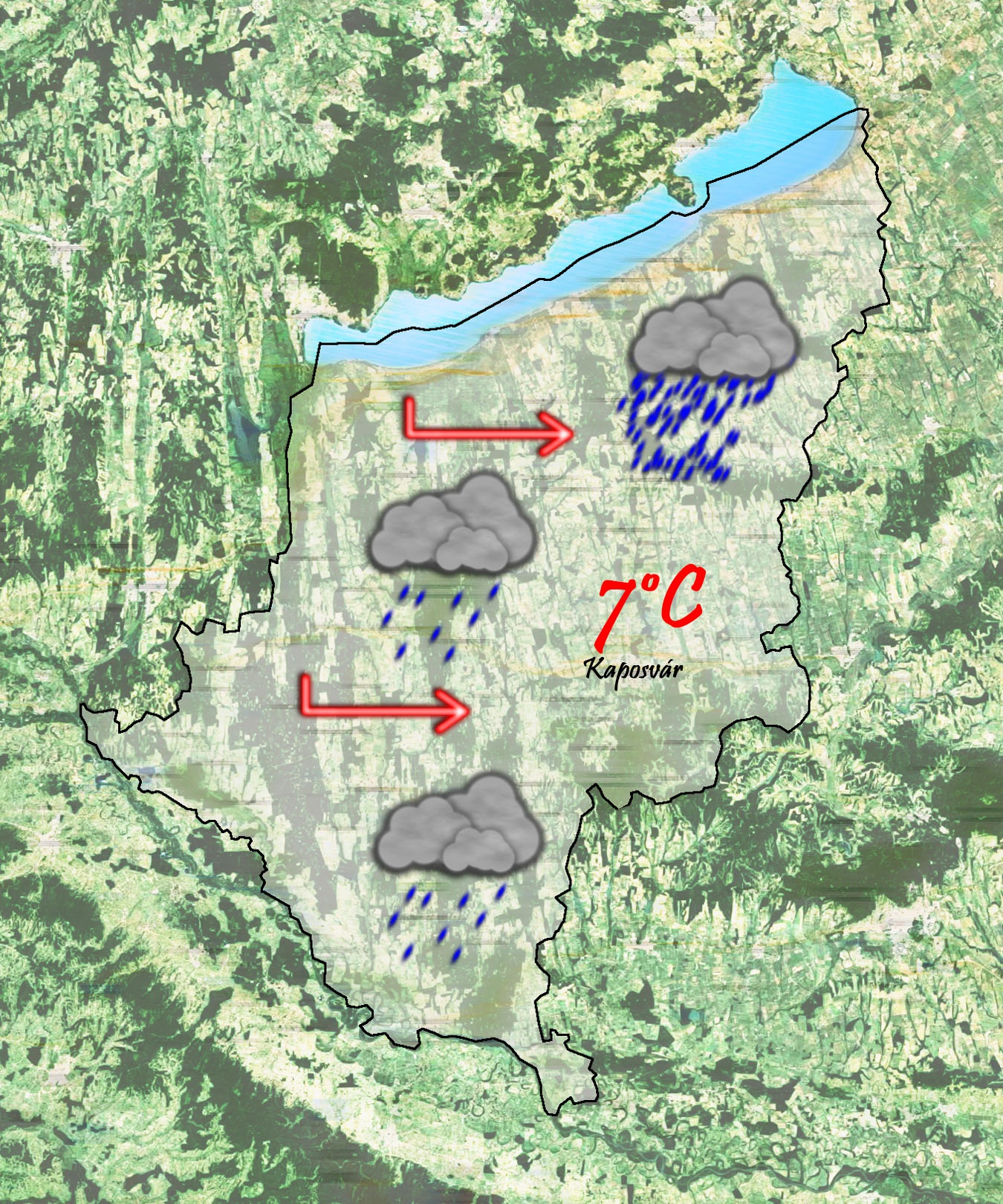 Szombaton reggel 3 °C-ig süllyed a hőmérséklet. A csapadékszünet után délnyugat felől újabb esők jönnek. Napközben végig esős, borult időre lehet számítani. Délutánra 7 °C-ig melegszik fel a levegő. Mérsékelt nyugati szél jelzi az enyhe, nedves légtömegek érkezését.
